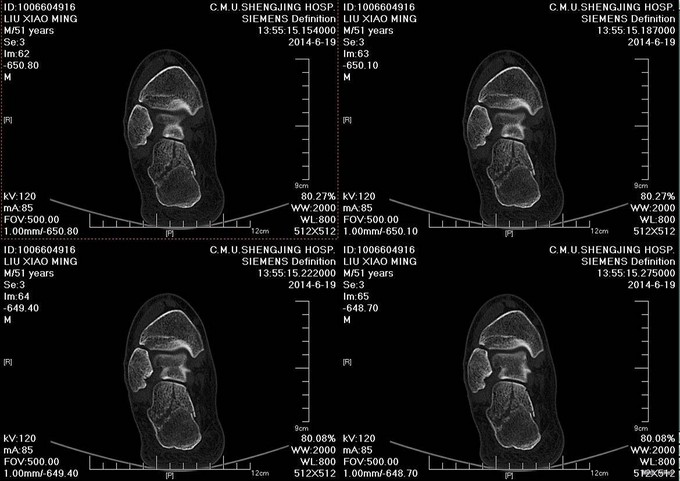 患者及其家属自述于2014-8-27 13:30 因在自家干活时不慎从2米高梯子上摔下,当时患者意识清醒,无法站立,左踝部疼痛、肿胀、活动受限;被急送往中国医科大学附属盛京医院,经急诊医师会诊后,建议住院治疗,患者及其家属今为进一步治疗,要求入院,我科以“右跟骨骨折”为诊断收入我科;患者伤来无发热、无头晕、恶心呕吐,无呼吸困难,既往饮食睡眠可,大小便正常;