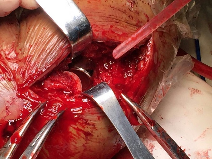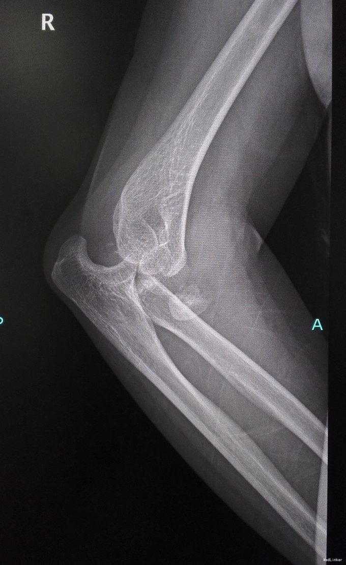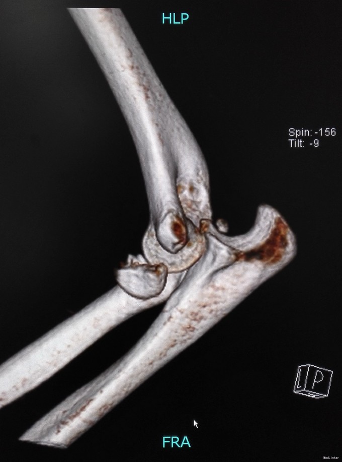 诊断为肘关节恐怖三联征(肘关节后脱位伴桡骨头和尺骨冠状突骨折),消肿后予以切开复位Wright桡骨小头假体置换,外侧副韧带修补,冠状突骨块小,未行固定。