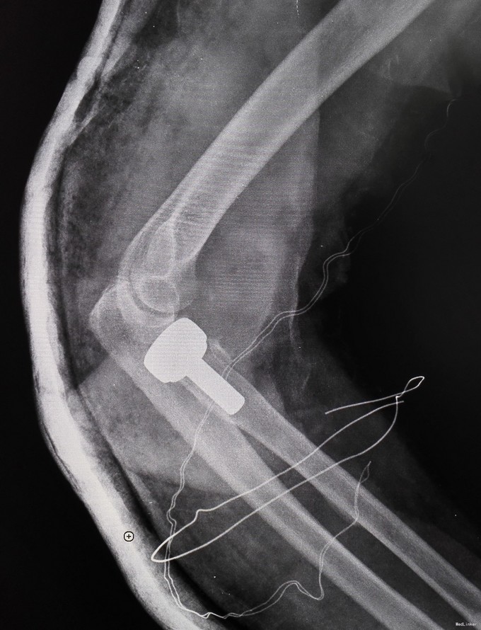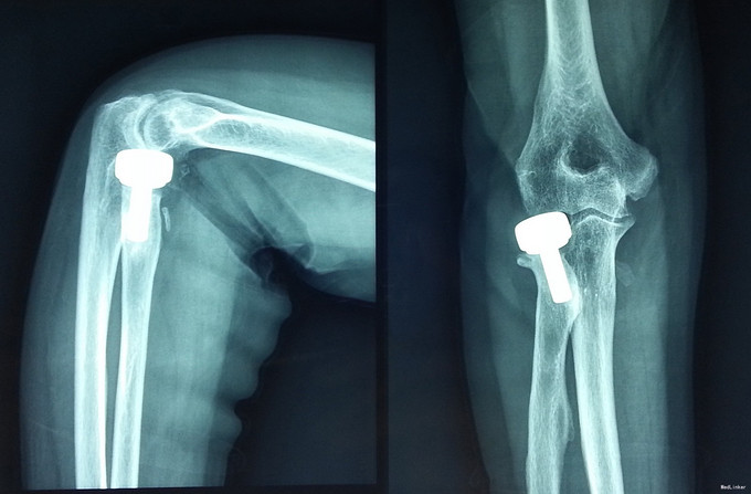 术后近两年,桡骨近端假体承载处骨赘增生,但患者功能良好,无不适主诉,疗效满意
