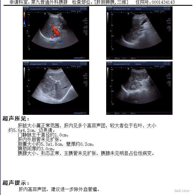 主诉: 体检发现肝血管瘤10年。 病史:患者十年前体检发现肝多发血管瘤,无发热,无恶心呕吐,无腹痛或腹胀,未在意。近期发现血管瘤逐渐增大,现为求进一步诊治就诊于我院。门诊以“肝血管瘤”为诊断收入我科。病来睡眠饮食可,二便如常,体重无明显减轻。