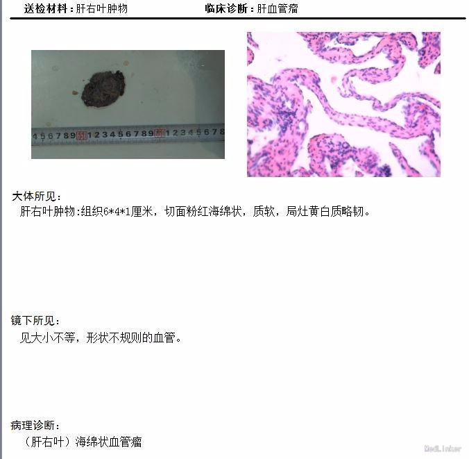 诊断: 肝血管瘤 治疗:全麻下腹腔镜探查,见胆囊无异常,右叶后下段2枚血管瘤,大者直径5.4厘米,外生性,小的直径3厘米,扁平状,左叶脏面可见2厘米扁平血管瘤,术中诊断肝多发血管瘤,2枚较小血管瘤直接腔镜下电烧消除,较大的肝血管瘤继续腔镜下包膜外剥脱。手术时间130分钟,术中失血500毫升。 术后病理,镜下见大小不等,形状不规则的血管,病理诊断:(肝右叶)海绵状血管瘤。