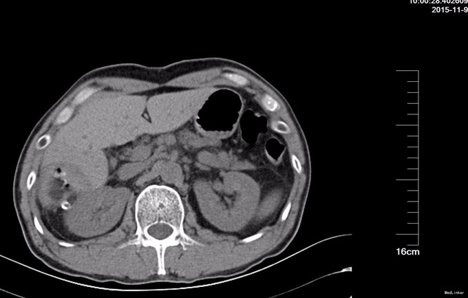 术后复查CT, 肝脏S4段及S6段可见两个低密度占位,与周围肝实质界限欠清,大小分别约25×16mm、51×48mm,前者边缘少量气泡;后者内可见气泡和少量稍高密度影,邻近导管外引流,周围脂肪间隙渗出改变。术后四天腹腔引流20毫升,予以拔除,病人出院。该血管瘤外生性,直径超过5厘米,尽管血管瘤恶变几率很低,但是肝血管瘤确实可以破裂出血,尤其像这样的外生性血管瘤。腔镜下切除肝血管瘤,由于控制出血比较可能,再加上容易破裂,总体上术中出血会比开腹多,手术时间也可能比开腹时间长,但是腹壁无大刀口,术后恢复确实比开腹手术快很多,保守估计,术后至出院时间比开腹手术的缩短1倍,患者受益,值得开展。
