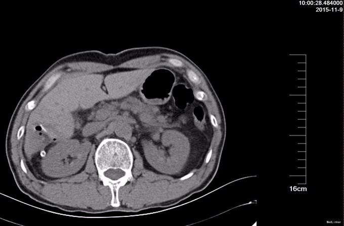 查体: 腹部平坦,未见胃肠型及蠕动波,未见腹壁静脉曲张,全腹软,无压痛,无反跳痛或腹肌紧张,未及腹部肿物,Murphy征阴性。肝脾肾区无叩击痛。移动性浊音阴性。肠鸣音4次/分。 辅查: BUS 提示肝脏大小属正常范围,肝内见多个高回声团,较大者位于右叶,大小约5.6x4.2cm,边界清。 门静脉主干直径约1.0cm。 肝内外胆管未见扩张。 胆囊大小约5.3x1.8cm,壁厚约0.2cm。 脾肋间厚约3.0cm。 胰腺大小、形态正常,主胰管未见扩张,胰腺未见明显占位性病变。