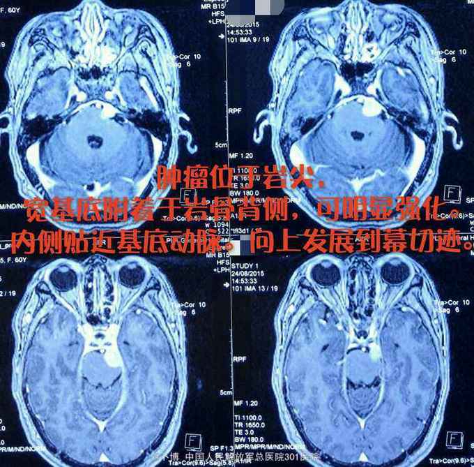 诊断:左侧岩斜脑膜瘤。 手术:乙状窦后入路。肿瘤位于面听神经的前方,将三叉神经根推向内侧。为了扩大显露并彻底切除肿瘤(基底),磨除了部分道上结节的骨质。 肿瘤全切。面听神经及三叉神经保留。