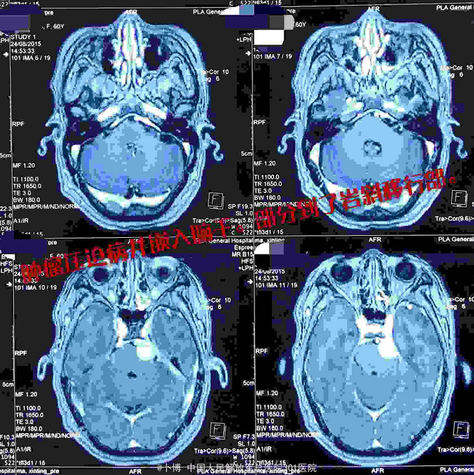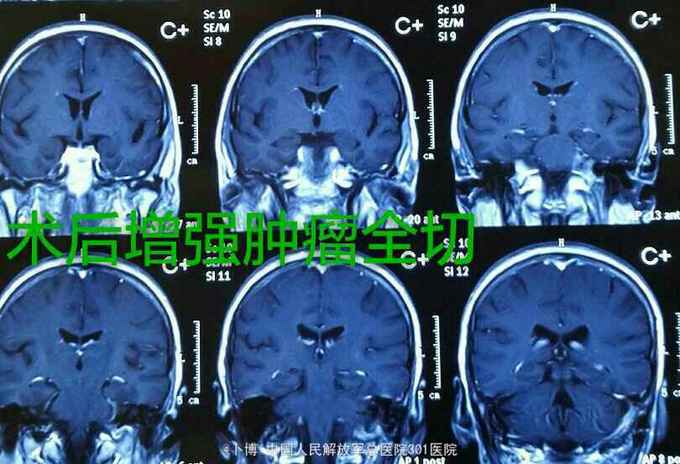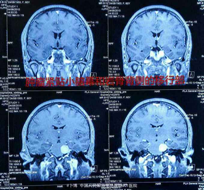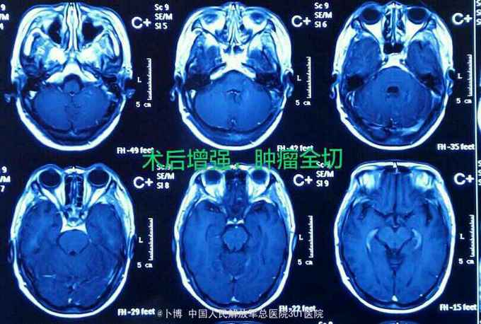 术后三个月复查。肿瘤全切。患者有面部麻木,疼痛消失。有轻度面瘫。听力尚存。