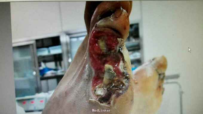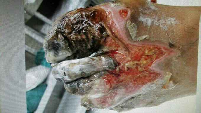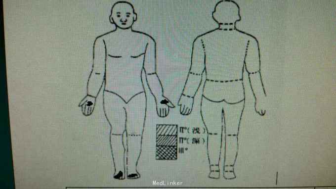创面分布四肢。面积3%。双足三度,共约2%。左足第1趾、第3趾部分坏死。左足第2趾坏死。右足第4趾部分坏死。右足第5趾坏死。创面污秽。分泌物多。
