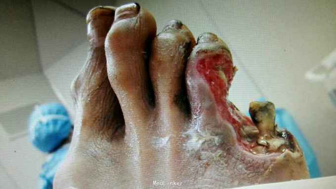 诊断:3%电击伤(三度);癫痫。 术前准备,入院第2天行“双足扩创+左足第2趾、右足第5趾截趾+VSD”术。6天后行“左足第1趾、第3趾截除+右足第4趾截除+自体皮移植”术。术后换药,术后24天创面愈合出院。下图为手术照片。