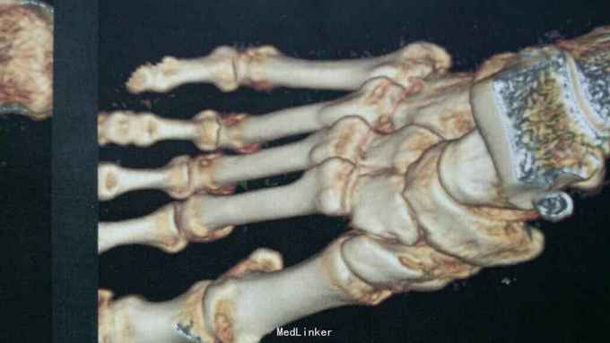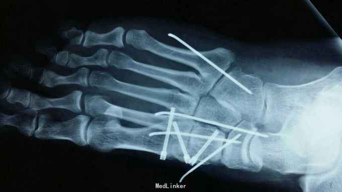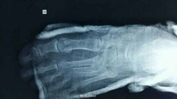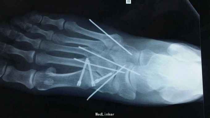 诊断:右足多发骨折伴跖跗关节脱位,韧带损伤 治疗:患者入院后,完善检查,于2015年11月25日行手术治疗,现切口愈合良好。