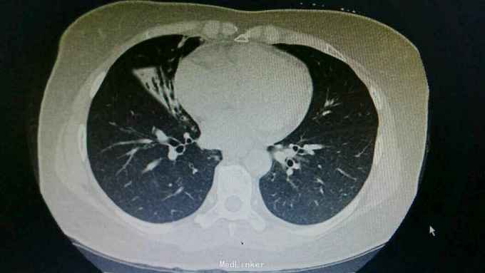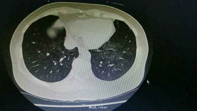 查体:右下肺闻及湿性啰音,余无特殊。 辅查:胸部CT:右肺中上叶支扩并感染,双肺下叶磨玻璃影,考虑肺泡内积血可能。