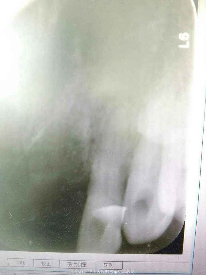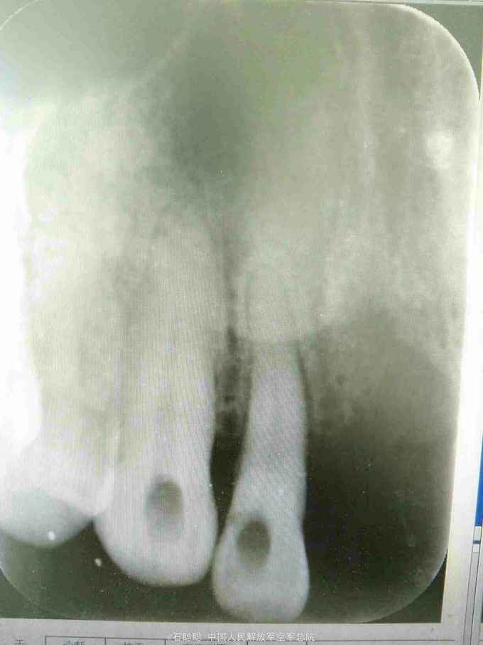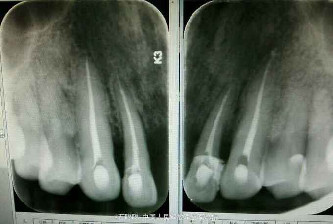 诊断:11、21缺失 治疗计划:向患者交代种植、活动、固定义齿修复方案的优缺点,患者考虑到种植周期长、活动修复难以满足美观要求,选择全瓷固定桥修复方案,但患者12、22基牙条件不甚理想,交代患者修复后要严密观察,定期复诊。 处置:12、13、22、23碧蓝局麻下开髓,拔髓,冲洗,置失活剂,氧化锌暂封 一周后复诊:去除暂封,测量根长,12=22=19mm,扩大至25#,13=23=24mm,扩大至35#,大量冲洗,干燥根管,置CP棉球,氧化锌暂封。 一周复诊:12、13、22、23去除暂封,试主尖,冲洗,干燥,冷测压充填,拍摄根尖片,恰填,置干棉球,氧化锌暂封 一周后复诊:12、13、22、23无不适,去除暂封,磷酸锌垫底,树脂充填,预备牙体,排龈,聚醚取模制作临时冠,调磨粘固 一周后复诊:试戴内冠,就位顺利,边缘密合 一周复诊:试戴全瓷桥,由于边缘密合,固位良好,调节正中咬合、前伸咬合、侧方咬合为轻接触,磨光U200粘固