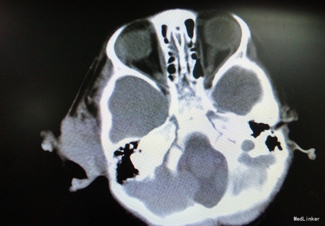 查体:右侧耳前可见一长约4cm手术切口瘢痕,愈合良好。 辅检:血常规:WBC 12.3×109/L 、N:11.96×109/L,Hb90g/L,PLT42*10^9;CRP:130mg/L,心电图示:窦性心律不齐,电轴左偏-1°,心电图大致正常。血培养示:粘质沙雷菌、产酸克雷伯菌,对亚胺培南敏感。