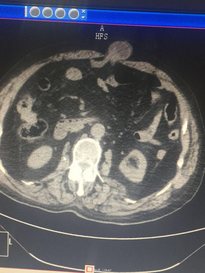 上腹壁见大小约5cm直径包块,压痛,质硬。