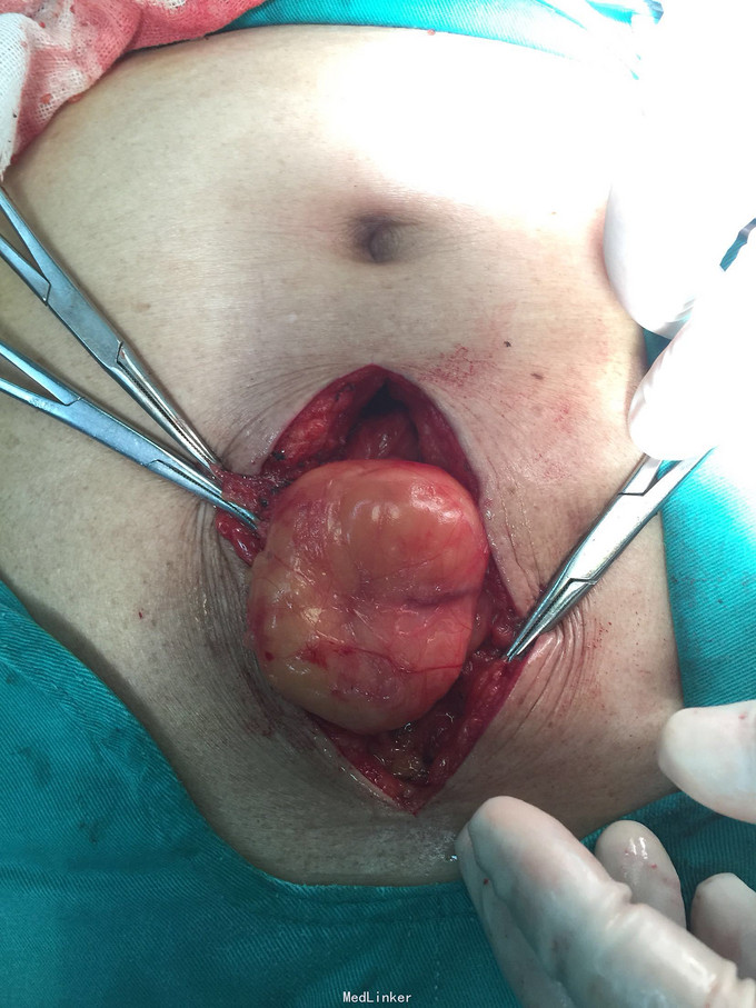 上腹部正中可复性包块10年不可还纳伴疼痛5小时