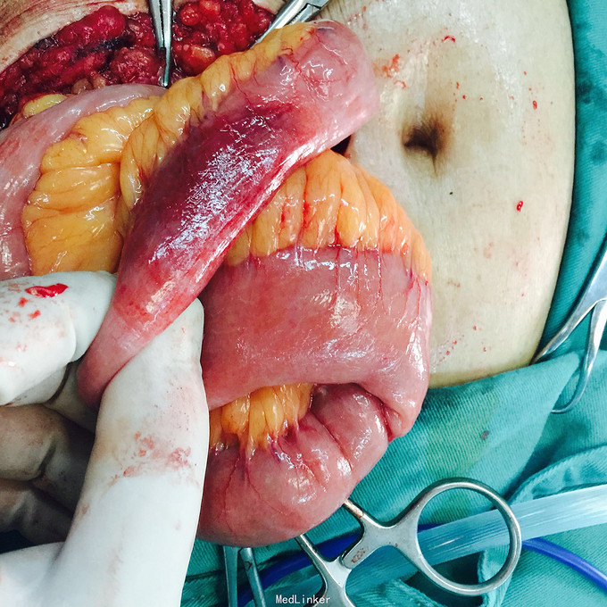 上腹部白线疝嵌顿,肠粘连,小肠嵌顿。肺炎。冠心病。白线缺损直径约4cm,急诊手术行上腹部白线疝嵌顿松解,小肠松解粘连,部分小肠还纳,白线疝补片修补术。