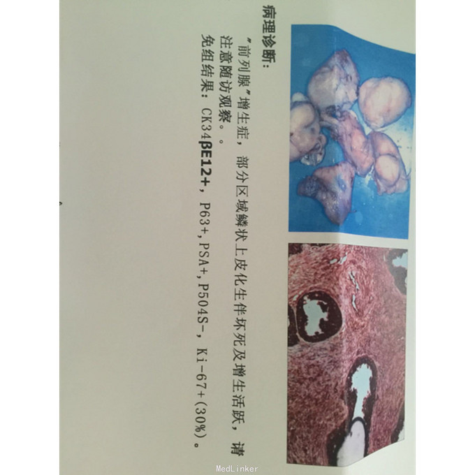 前列腺增生,前列腺癌?,肾功不全,双肾积水 安置尿管后仍反复出血,血色素下降至70左右,血压不稳,一般情况差,无法继续完善盆腔MRI等检查,急诊于全麻下行开放前列腺摘除术,术中摘除前列腺增生组织330g,无明显粘连,但术中出血多,但经治疗后病情恢复,目前生命体征平稳,病理结果暂未回。