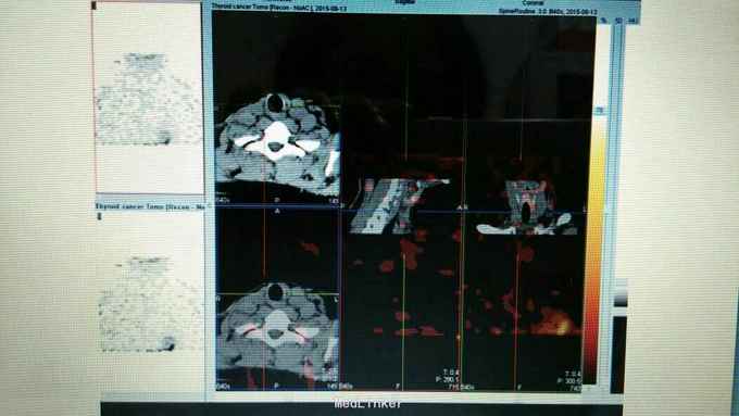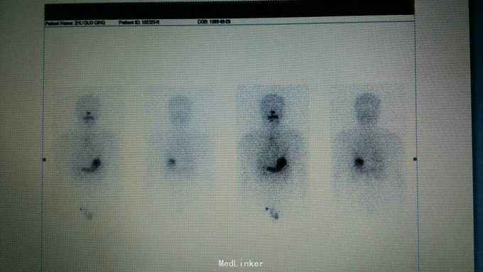 随访:嘱患者继续随访,包括甲功、甲状腺球蛋白、甲状腺超声及颈部超声、碘-131全身显像等。左甲状腺素片150ug Qd,患者已经有远处转移,复发危险度分层为高危组,TSH目标值要小于0.1 mIU/L。 讨论:我们在和甲状腺乳头状癌患者交流时,与其告诉患者这是一种恶性肿瘤,还不如说是一种慢性病,因为这种疾病治愈率较高可达75%左右,只要及时治疗,定期随访,预后还是很好的。本例患者青年起病,虽然有淋巴结和肺转移,但是经过数次放射性碘治疗,核素显像提示全身未见异常放射性分布灶,Tg水平很低,小于1 ng/mL,治疗效果还是非常好的。 分化型甲状腺癌患者在手术和碘-131治疗后,如果达到下列标准,可以评定为临床治愈:1.没有肿瘤存在的临床证据;2.没有肿瘤存在的影像学证据;3. 碘-131清甲治疗后的全身扫描没有发现甲状腺床和甲状腺床以外组织摄取碘-131;4.TSH抑制状态下和TSH刺激后,在无TgAb干扰时,测不到血清Tg(一般为Tg<1ng/ml)。