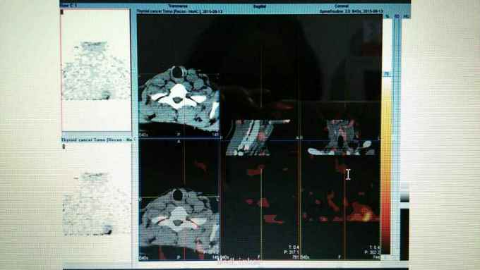 1.主诉:患者青年男性,甲状腺癌术后1年,第二次碘-131治疗后6月余。 2.现病史:患者1年前体检发现右侧颈部肿物。2014-07-11于首都医科大学附属北京世纪坛医院在全麻下行“甲状腺癌联合切除+近颅底转移癌切除+甲状旁腺探查(双)+喉返神经成形(双)+颈内静脉、颈总探查(双)、腮腺部分切除(右)+臂丛神经松解(双)+胸导管结扎术”。术后病理示:甲状腺乳头状癌。分别进行两次碘-131治疗,剂量分别为200mCi、175mCi。第二次治疗后碘-131全身显像示:甲状腺癌,肺转移癌131I治疗后:1.右侧颏下放射性碘浓聚,考虑淋巴结转移。2.双肺转移灶未见放射性碘摄取。患者此次入院为进一步复查。 3.既往体健。个人史、家族史无特殊记载。