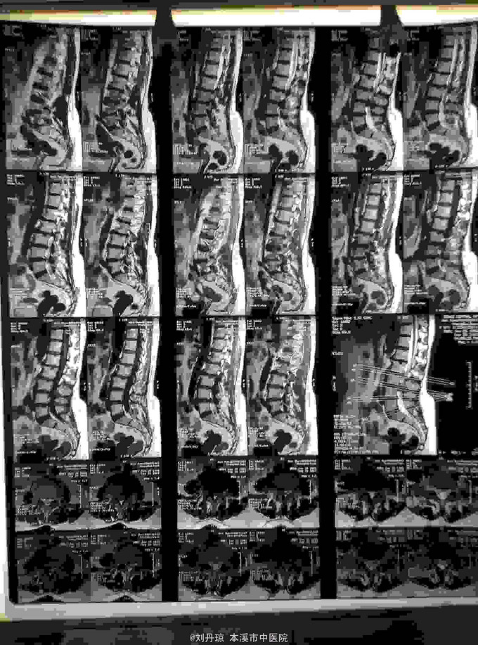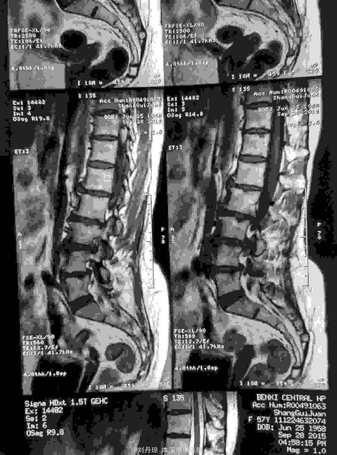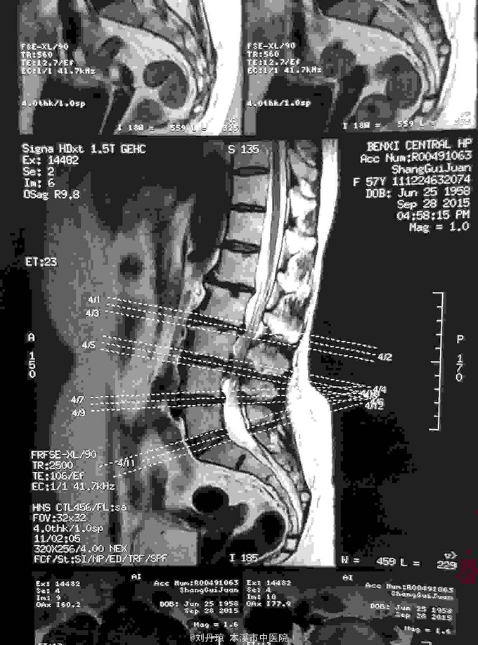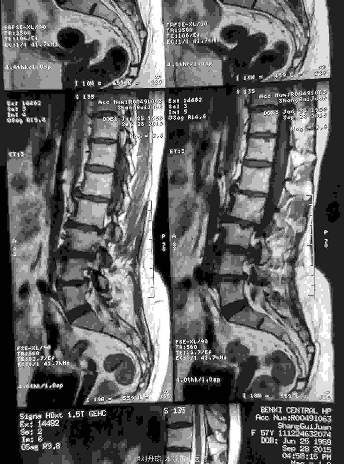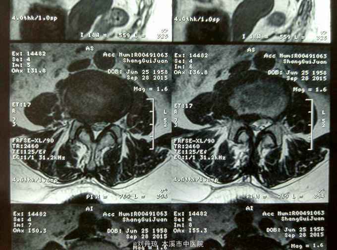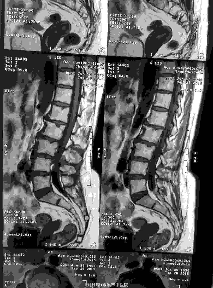 诊断:腰椎间盘突出症 治疗:针灸、雷火灸、中药熏药治疗、小针刀治疗、骶管注射治疗、营养神经药物治疗、脱水药物治疗,当归地黄饮加味。