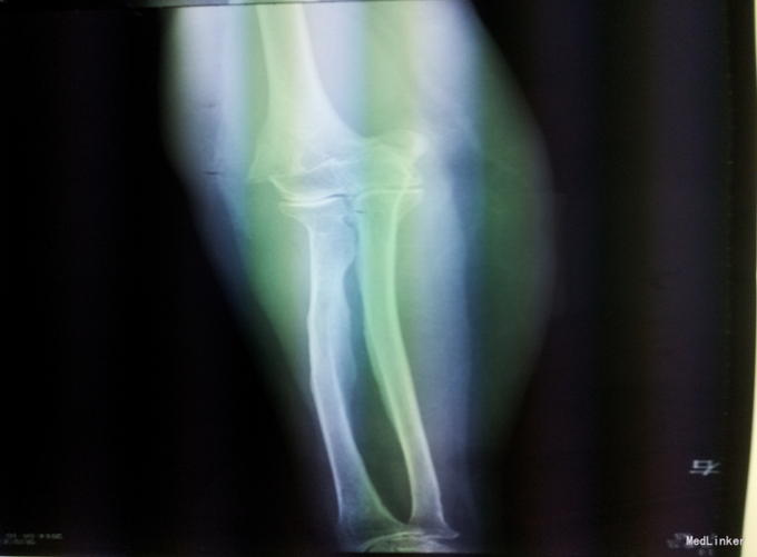 辅助检查:右上肢及手部肿胀,前臂绷带悬吊中,右肘关节及周围压痛,可触及骨擦音,骨擦感。左膝关节处肿胀。四肢感觉正常,肌张力正常。右侧握力、右腕背伸4级,余四肢肌力正常。右桡动脉搏动良好。