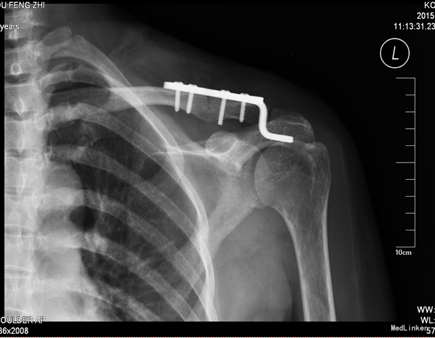 主诉:车祸致左肩部疼痛畸形活动受限四月余。现病史:患者及家属自诉4月前因发生车祸左肩锁关节脱位,左尺骨骨折,后于本溪市中心医院行尺骨骨折切开复位内固定术,手术成功,肩锁关节脱位未行治疗。术后给予对症治疗,患者恢复良好。现患者为求肩锁关节脱位进一步治疗前来我院。现以“左尺骨骨折术后,左肩锁关节脱位”为诊断收入我科住院。伤来患者无头痛及发热,无咳嗽咳痰,无腹痛及恶心呕吐,大小便正常,排气正常。