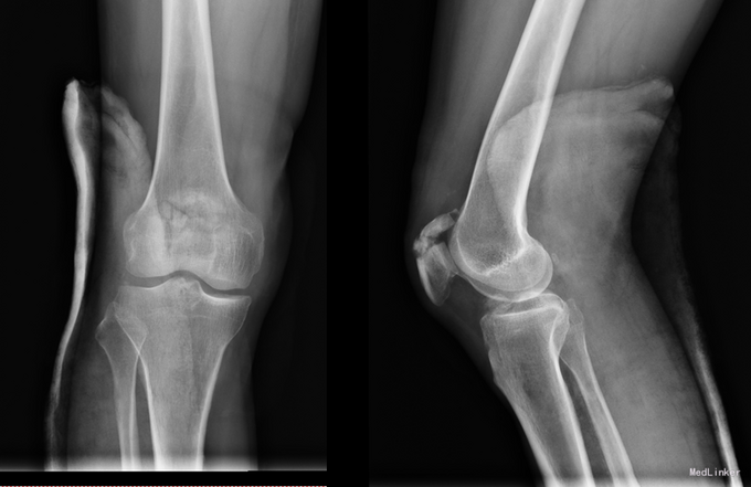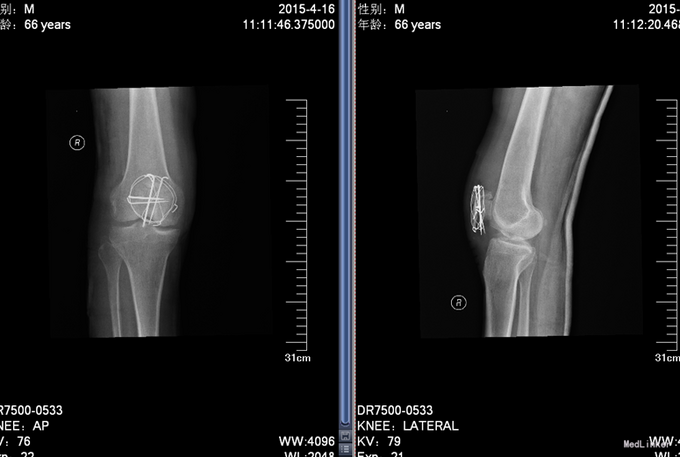 主诉:右膝关节疼痛活动受限9小时。现病史:9小时前骑摩托时发生车祸,患者当时头面部及右下肢受创,患者神志尚清楚,患者家属急送患者到当地黑山县医院,行头部CT及右下肢DR检查,头部CT提示:右颞部硬膜下血肿可能性大,右下肢DR提示右侧髌骨粉碎性骨折,给予对症处理后患者症状未见好转.为求进一步治疗,患者家属急送患者到我院急诊,行头部CT检查提示右颞部硬膜下血肿可能性大.为进一步治疗,将患者转入我科.