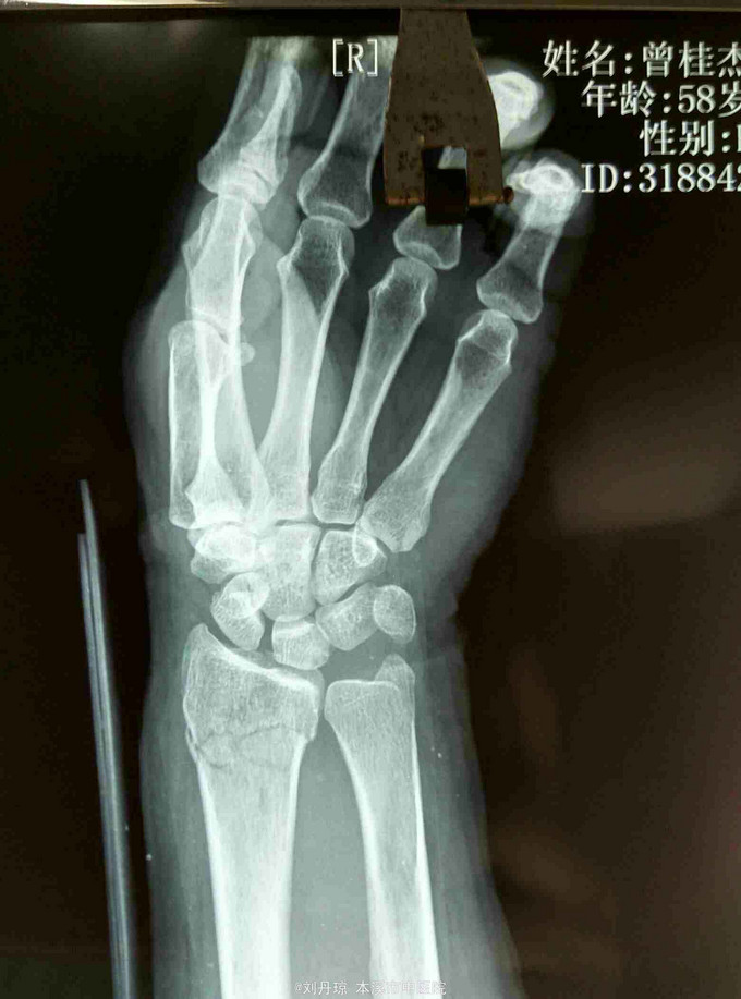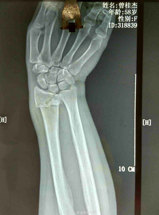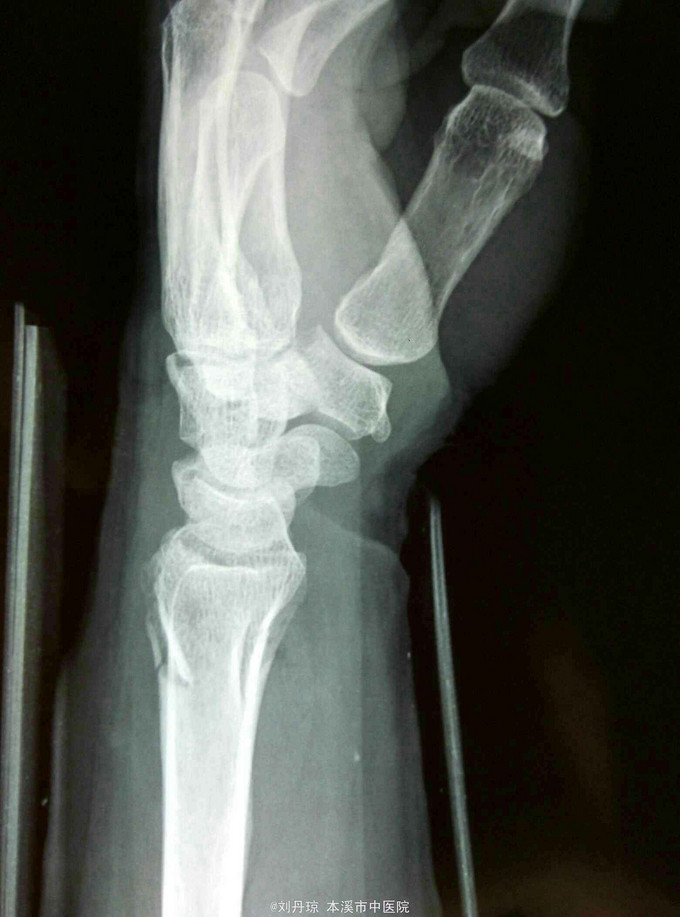 随访|年。摔倒时腕关节极度背伸,使前臂旋前的扭力向前运动,导致此型骨折。colles 骨折占前臂骨折的75%,多见于中老年女性。colles骨折是最常见的骨折。典型表现为餐叉状畸形。主要包括然后远端向背侧移位和倾斜,桡偏,桡骨短缩,骨折常涉及桡腕关节和下尺桡关节。尺骨茎突骨折也是常见的合并损伤。