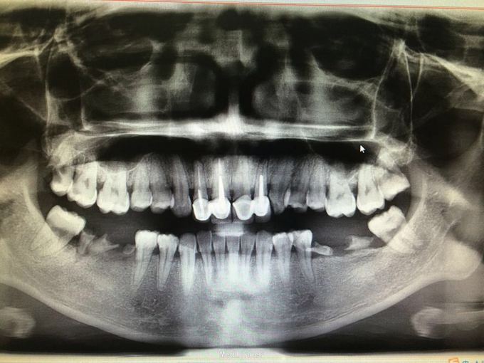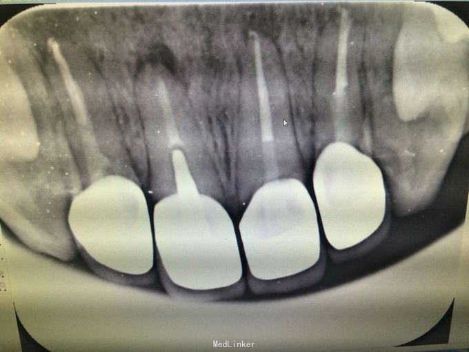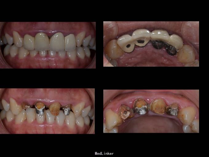 11 12 21 22金属烤瓷冠修复,牙龈发黑,冠颈部牙龈萎缩红肿有黑褐色腐质物,探出血,叩(-).23近中颊侧扭转倾斜.36 37 46 47残根,松动轻,全口牙结石中度,牙齿颜色偏黄,全景片示,11 12 21 22根管治疗不完善,根尖低密度影,有金属桩修复