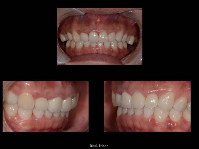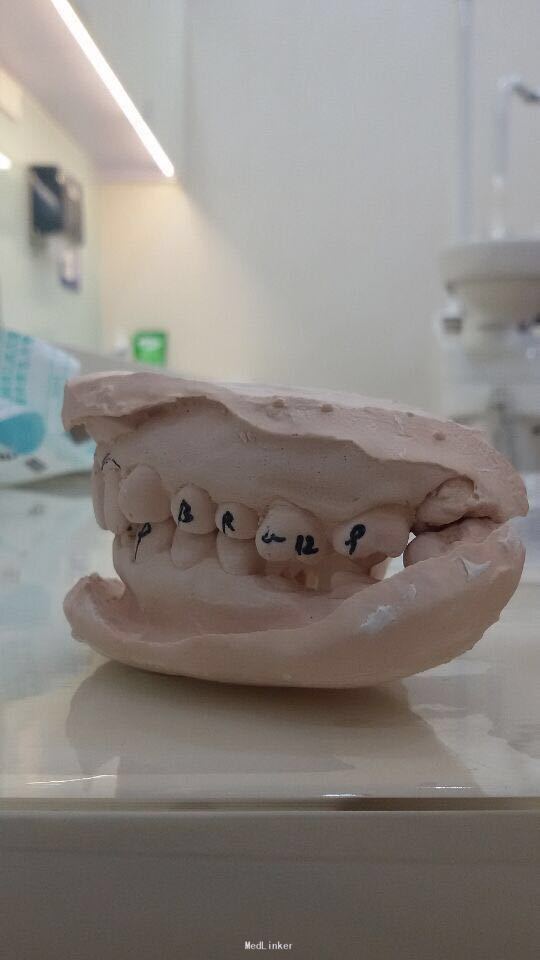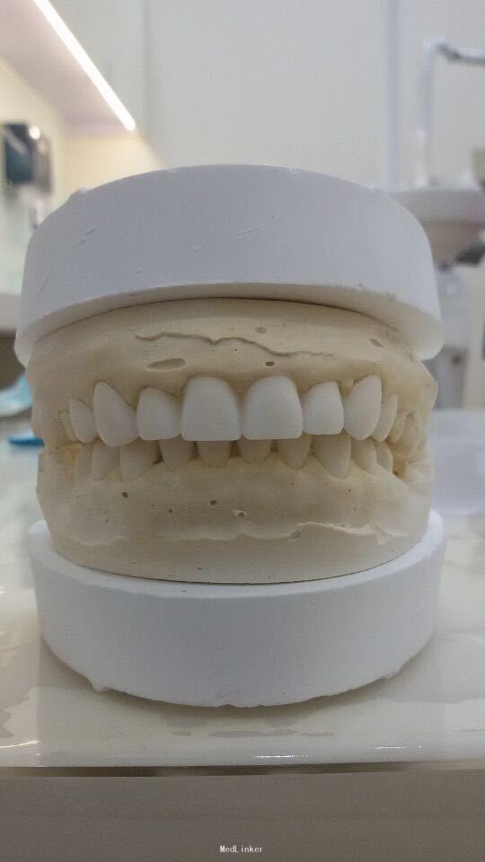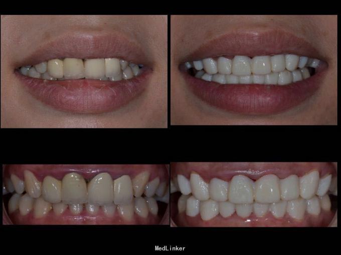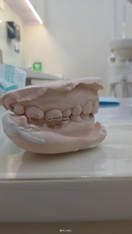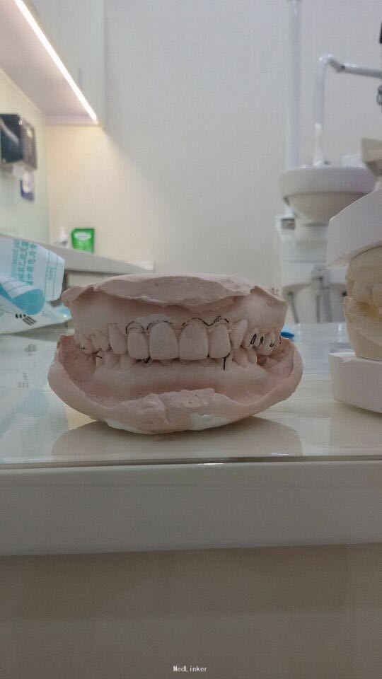 11 12 21 22死髓牙,不良修复体,牙龈炎 36 37 46 47残根 牙列不齐 处置:全口洁治。 比色,拍照,取模型做蜡型。 拆除旧修复体,拆桩核,做根管治疗,纤维桩修复,牙体预备,取模,做临时冠,粘固。11 12 21 22全瓷冠修复,13 14 23 24 31 32 33 34 41 42 43 44瓷贴面修复。