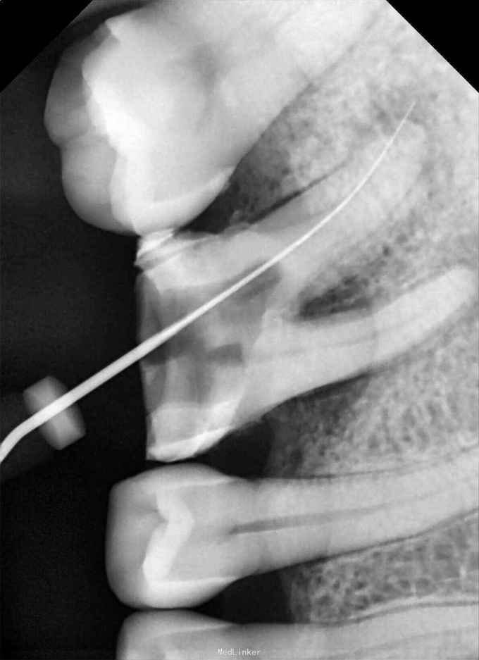器械分离是根管治疗过程中的常见并发症,位于根管上段的比较容易取出,不过要小心谨慎,以防底穿、根管侧穿,不锈钢器械能够传递超声,分离后使用超声在器械周围逆时针旋转振荡就会慢慢变松(拆金属桩同样如此,断针就是一颗袖珍版的金属桩),但镍钛器械用超声振荡会产热,发生二次器械分离,应优先建立根管旁路
