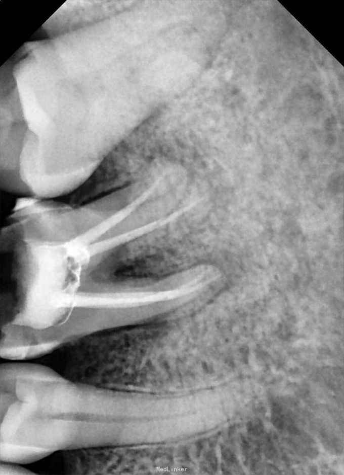 诊断:36牙慢性根尖周炎 治疗:36牙探及根管口④,远颊根管口阻塞,选用尖头金刚砂车针去除部分髓底,暴露断针头部,超声(P尖)逆时针振荡,直到断针松动,然后用血管钳取出断针,疏通根管,机扩,充填,术后1个月复查,根尖暗影范围略有缩小