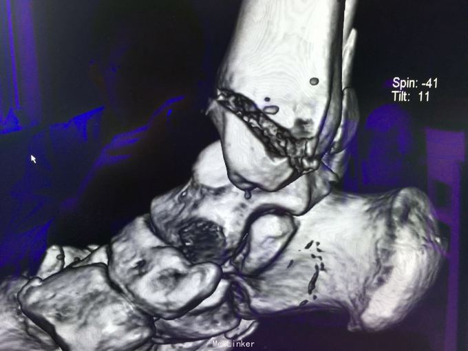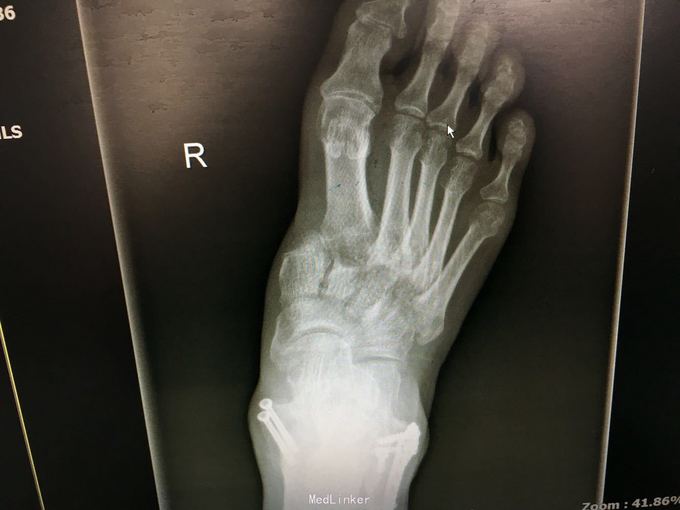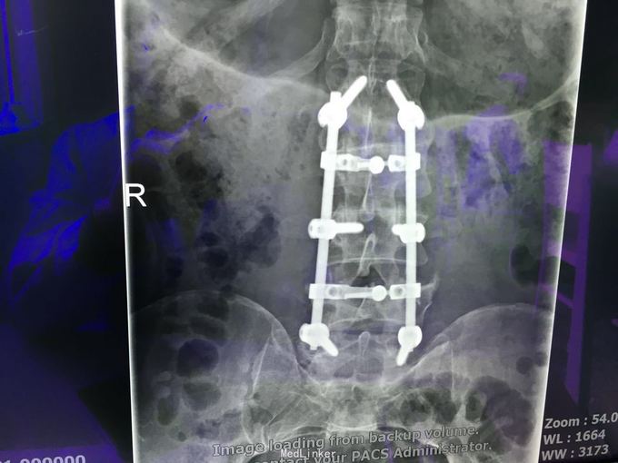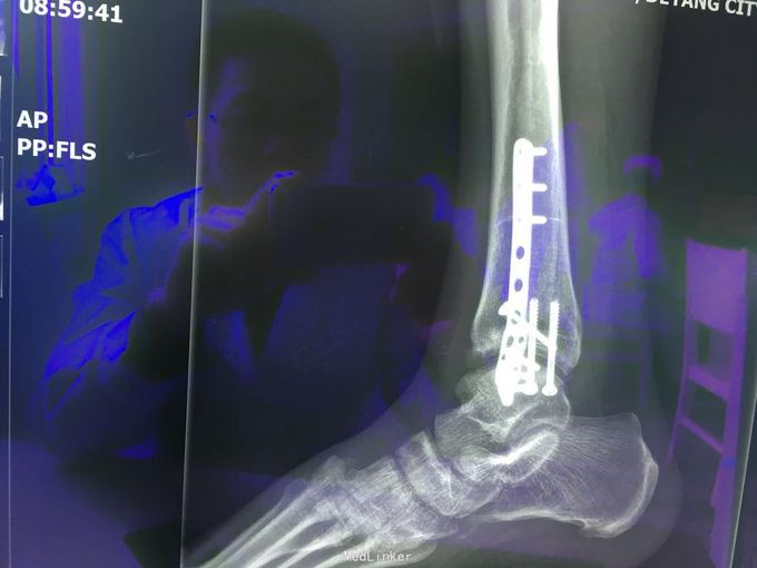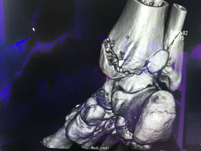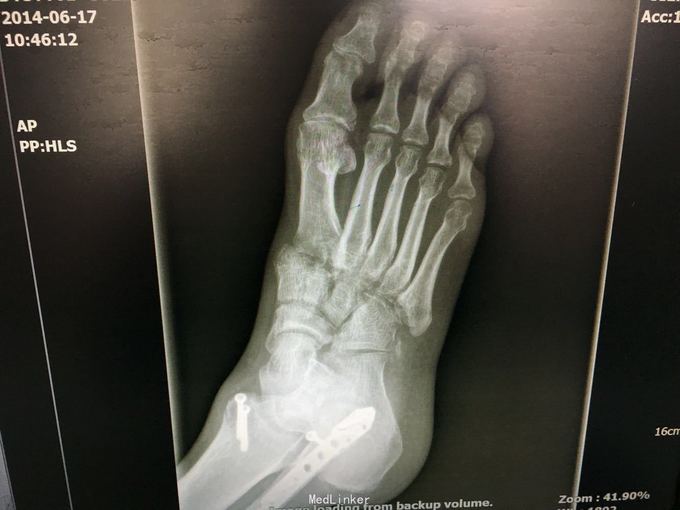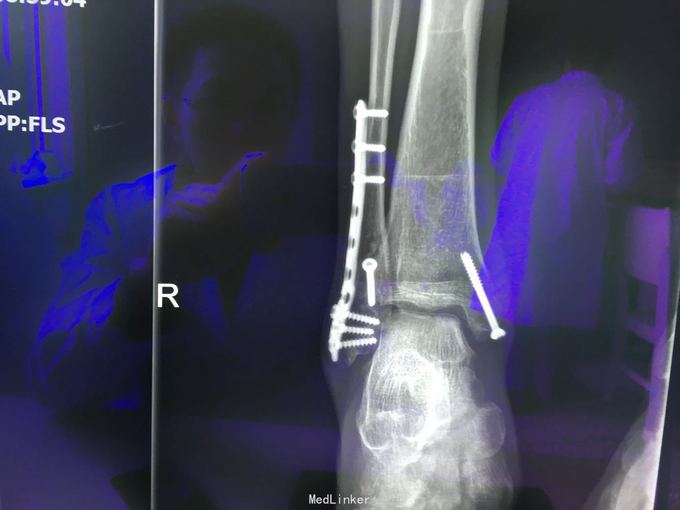 诊断:右足lisfrance损伤,左肾挫裂伤;左肾周血肿,左侧输尿管结石伴左肾重度积水,L2、L4椎体骨折,L1-L4左侧横突骨折,右侧坐骨支骨折,右三踝骨折,全身多处皮肤软组织挫伤 处理:急诊行左肾探查,左肾切除术,择期行经后路腰2、4椎体骨折切开复位、椎公根螺钉内固定术+右内、外踝骨折切开复位内固定术,择期行右足lisfrance关节复位克氏针内固定术。
