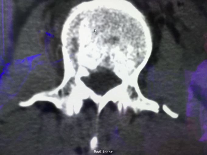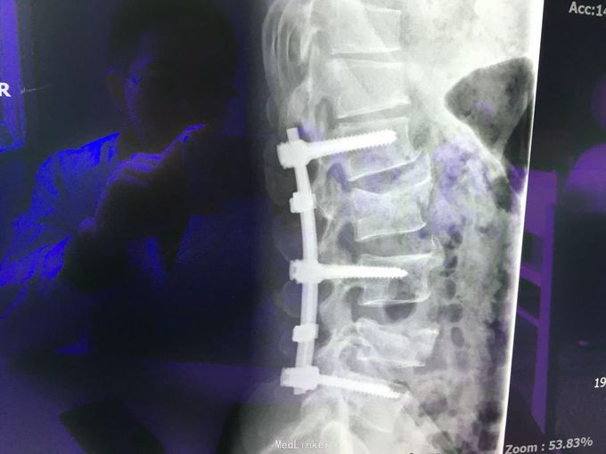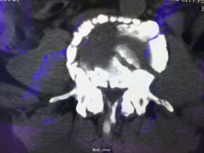 查体:左肾区叩痛,无皮肤隆起,未扪及肿块;腰椎压痛,活动受限,双下肢感觉存在,右小腿石膏托外固定,有踝关节明显肿胀,局部压痛活动受限,指端感觉血运可。 CT及X片:L2、L4椎体爆裂性骨折,L1-L4左侧横突骨折,右坐骨支骨折,右侧胫骨内、后及右侧腓骨外踝骨折,右足第1-4跖骨向外侧脱位及半脱位,伴近端斯脱性骨折。左肾挫裂伤,左肾重度积水,左肾周血肿。