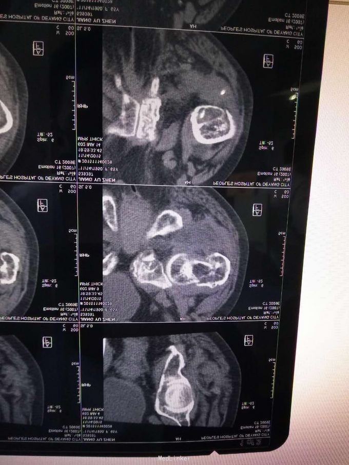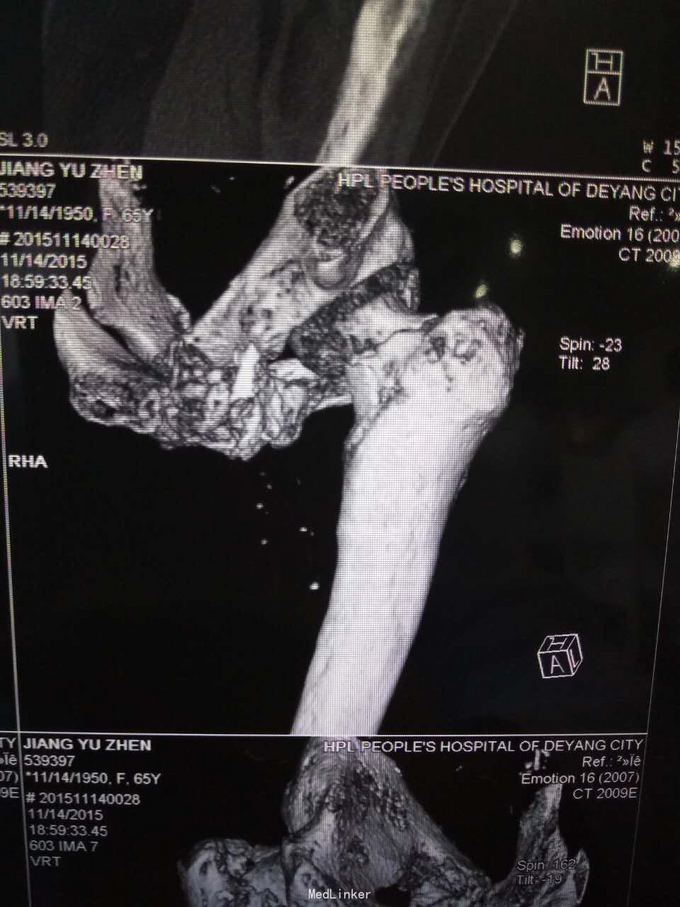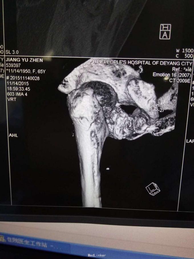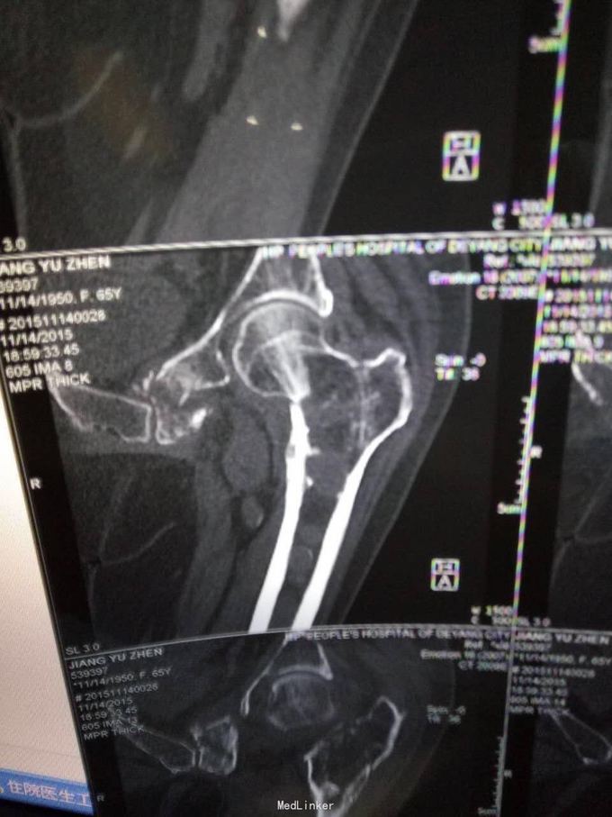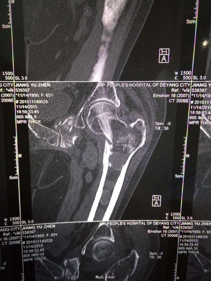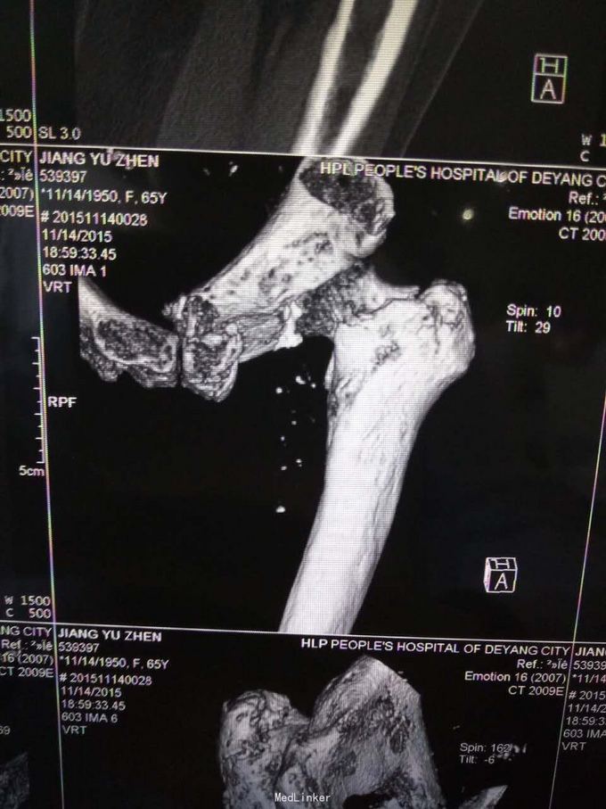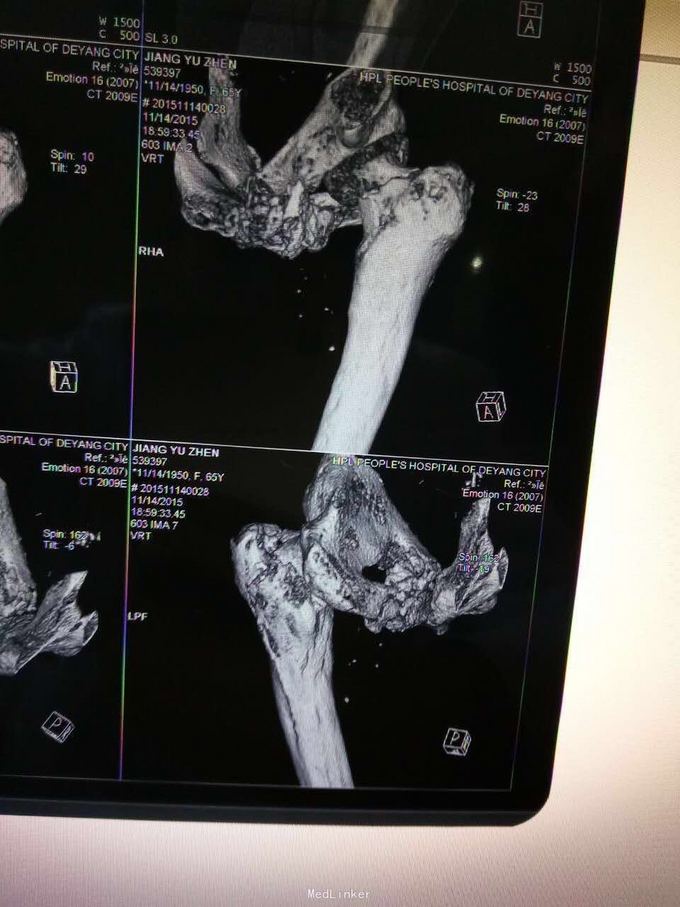 诊断:左股骨颈、转子间粉碎性骨折,左耻骨上支、耻骨联合、下支粉碎性骨折,重度骨质疏松症, 处理:患肢制动,牵引,注射鲑降钙素,科室讨论意见为行髋关节置换术,与换方沟通后,换方表示拒绝手术治疗,主动出院。