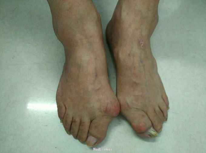 血压160/90mmHG,心率75次每分。右足第一柘趾关节红肿压痛,双足可见痛风石。