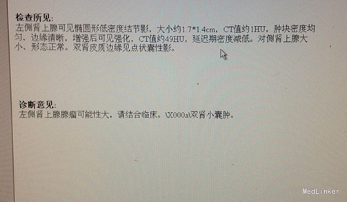 入院查体:无明显异常。 辅助检查: 肾上腺皮质激素系列 8:00 15:00 24:00 促肾上腺皮质激素测定ACTH 9.36pg/ml 7.9pg/ml 4.67pg/ml 皮质醇测定COR 545.9nmol/L 227.5nmol/L 137.7nmol/L 卧位 立位 血管紧张素II测定 41.00ng/mL 71.00ng/mL 血管紧张素I测定 0.53ng/mL 3.6ng/mL 醛固酮测定ALD 0.1ng/mL 0.14ng/mL 卧位 立位 血管紧张素II测定 29.00ng/mL 57.00ng/mL 血管紧张素I测定 0.27ng/mL 0.98ng/mL 醛固酮测定ALD 0.15ng/mL 0.18ng/mL 肝胆脾胰彩超:肝胆脾胰双肾膀胱未见明显异常,残尿量约:17ml。肾上腺增强:左侧肾上腺腺瘤可能性大,请结合临床。双肾小囊肿。