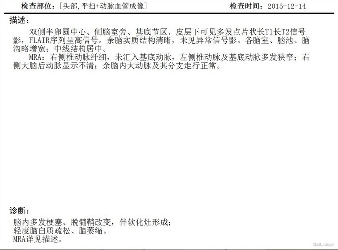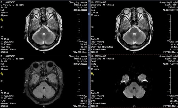 1.患者老年男性,69岁,急性起病,以“头晕3天,加重1天”为主诉入院。 2.患者3天前无明显诱因突然出现头晕,偶有恶心未吐,无视物旋转及视物模糊,无耳鸣及听力下降,无肢体活动障碍。测量血压可达180/100mmHg,休息并服用1片开博通后可缓解。昨日晚10点头迷突然加重,伴视物旋转,无恶心呕吐,不敢睁眼及活动,测量血压180/100mmHg,休息后并口服1片开博通未见缓解。遂拨打120来我院急诊科,测量血压达200/110mmHg。给予对症治疗后头晕略见好转,现为求进一步诊治来我科住院。患者病来无意识障碍,无抽搐,无饮水呛咳及吞咽困难,无四肢活动障碍。无胸痛及气短,无腹痛腹泻。饮食可,睡眠尚可,二便正常。近期无明显体重变化。 3.既往史:高血压病史十余年,最高达200/120mmHg,平时硝苯地平控释片及厄贝沙坦片口服控制血压,血压稳定在150/90mmHg左右;否认冠心病、糖尿病病史;于今年6月份因头晕恶心呕吐在医大一院就诊,诊断多发腔梗,病情好转后出院;于今年10月份因头晕恶心呕吐来我科就诊,诊断椎基底动脉供血不足,病情好转后出院;否认手术外伤史,否认输血史,否认肝炎、结核等传染病史。 过敏史:否认药物及食物过敏史。 个人史:否认吸烟及饮酒史。 家族史:否认家族遗传病史。