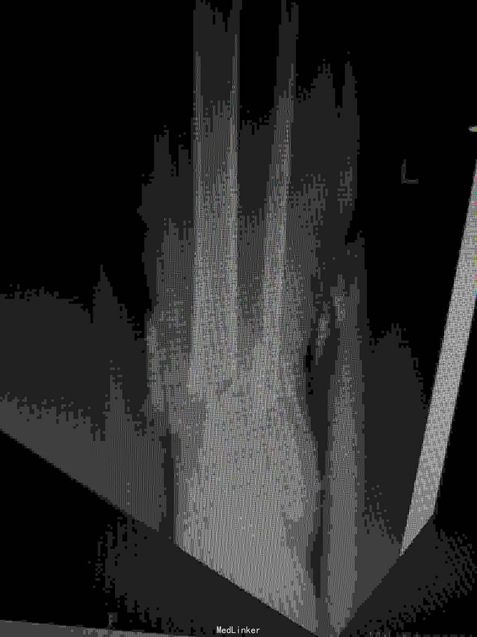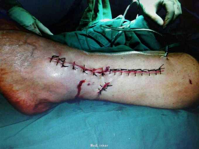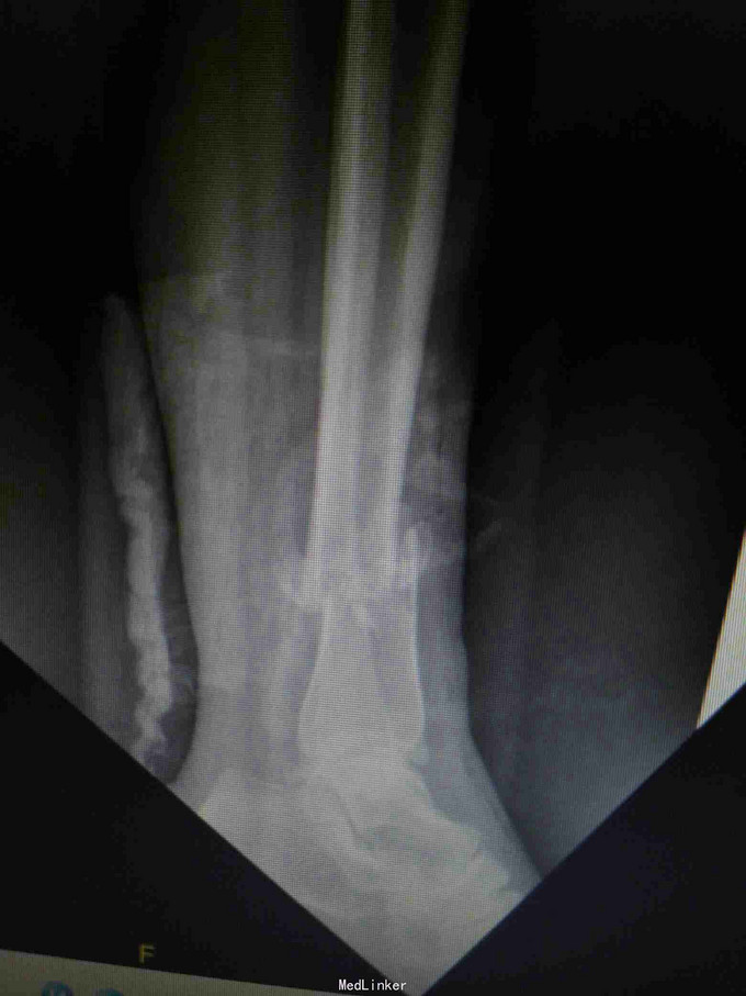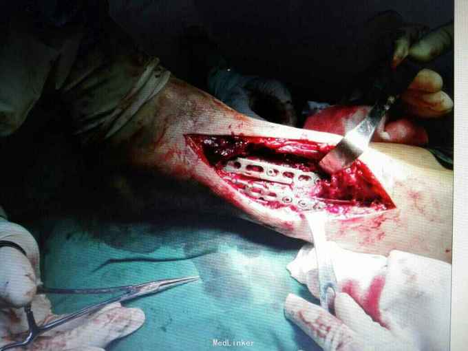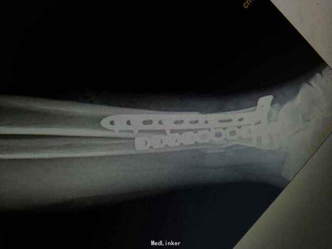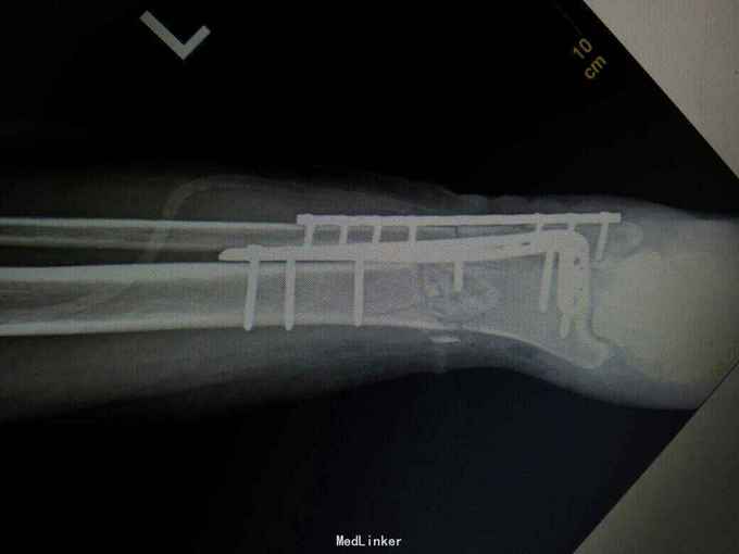 术后复查X线片提示骨折端对位对线好,伤口正常愈合,未出现感染。 讨论:患者内侧可见开放伤口,这时候采用内侧开放复位钢板固定感染概率大,我们采用前外侧切口,可避开内侧伤口,同时可清楚显露胫腓骨下段骨折端,并可有效固定。