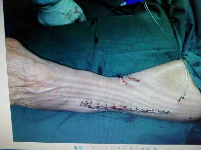 诊断:左胫腓骨下段开放性骨折。 治疗:考虑内侧有开放伤口,行内侧钢板固定感染概率大,我们采用前外侧入路,显露胫腓骨下段骨折端进行固定。