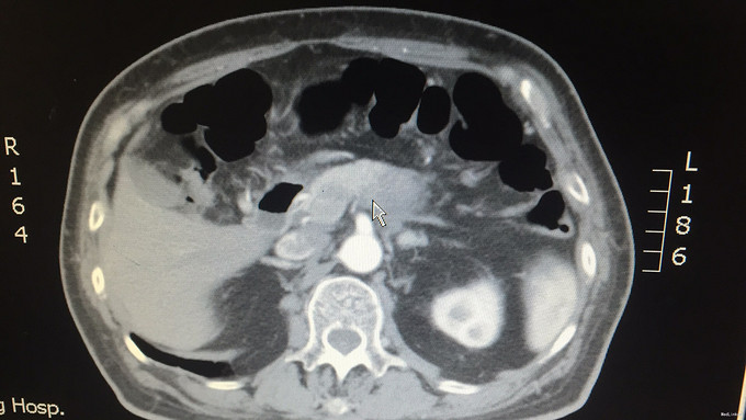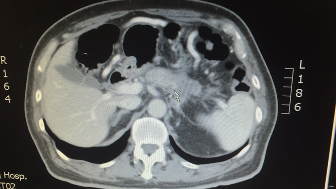 诊断:1.胰体尾占位 2.高血压 3.II型糖尿病 治疗:患者入院后,完善相关术前检查,排除手术禁忌,与入院后第5天行腹腔镜探查+开腹胰体尾部肿块活检+胃空肠吻合术。术中腹腔镜探查见:腹腔内无腹水,腹膜腔未见明显转移灶,故决定行开腹手术。开腹探查见:胰腺体尾部有一6*5cm大小肿块,灰白色,质地坚硬,并侵犯十二指肠空肠曲,与后腹膜较固定,活动度差。考虑胰体尾部癌侵犯十二指肠空肠曲及后腹膜,无法根治性切除,且有导致肠梗阻趋势,决定行胃窦可见一6*4*3cm肿块,质地硬,已侵犯浆膜,胃体胃壁明显水肿增厚,结合胃镜,术中诊断胃窦癌伴幽门梗阻明确。故决定行胰体尾部肿块活检+胃空肠吻合术。手术顺利,术后给予常规抗炎、止血、抑酸、保肝等对症支持治疗。术后第9天出院。