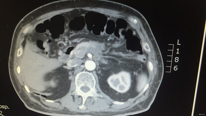 主诉:体检发现腹部占位半月余。 病史:患者于入院前半月余子啊外院体检发现癌胚抗原升高,达41.39ng/ml,遵体检医师建议,于外院行中上腹部MRI增强检查,结果提示:胰腺体尾部占位,考虑恶性,胰腺癌可能性大。未予进一步治疗。患者既往无上腹部疼痛,无发热、乏力,无恶心、呕吐、厌食,无尿黄、陶土样便,皮肤无异常黄染,无寒战、心慌、气急,无反酸嗳气等异常。今为求进一步手术治疗,来我院治疗。患者既往有糖尿病史20余年,服用格列奈、二甲双胍控制血糖,血糖控制不佳,近期在外院行胰岛素皮下注射治疗,早16iu,晚12iu,血糖控制可。