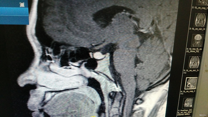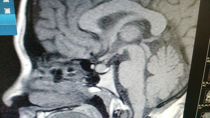 患者以“间断停经4年余,头疼、恶心半月余”入院 患者4年余前无明显诱因出现停经、体重增加,持续约半年,未系统诊治,随后经运动减肥后体重下降(具体不详),半年后月经来潮,此后经量较停经前减少,约2-3天/次,月经周期延长,约40天。4个月前,患者无明显诱因停经至今,半月余前患者出现头痛,以左侧及眼眶周围为重,伴有头晕、耳鸣,发作时自觉恶心,无呕吐,双眼视物模糊,以左眼为重,无昏厥,无心慌、气短,无一过性黑曚。就诊于当地医院,完善垂体核磁,提示“垂体饱满”,建议入我院系统诊治。