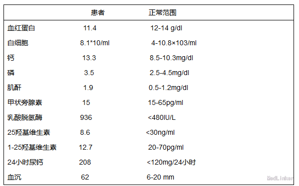 诊断:高钙血症、巨脾 治疗: 随后几天静脉输注生理盐水和呋塞米后,她的血清钙浓度逐渐得到纠正。她未接受任何其他治疗高钙血症的特殊疗法(如降钙素或双磷酸盐)。入院第5天,她进行了脾切除术,切下来的脾脏巨大,大小为22×18×14cm ,重1800 g,内有一个质硬的肿块。
