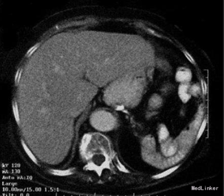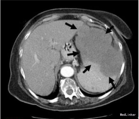 主诉:女性因低热、厌食、腹部不适和左腹胀6个月前来就诊。6个月前的腹部CT扫描显示脾充盈缺损,当时解释为脾脏囊肿,未予特殊治疗。体检发现她有轻度贫血,自诉易疲劳。