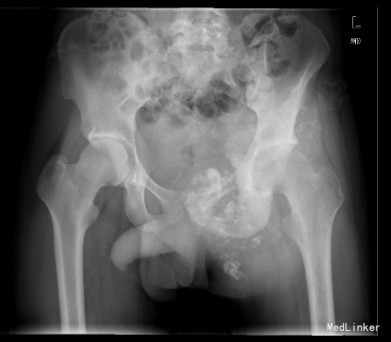 查体:左侧臀部内侧区隆起,局部皮肤无充血红肿,无浅静脉怒张,无皮肤破溃、皮疹及足癣。左侧臀部内侧区及左侧腹股沟区可触及巨大圆形包块,质硬,压痛明显,皮温不高,无明显触觉减退区,左足背动脉搏动正常,肢端末梢血循环正常。 辅查:骨盆CT提示左髂骨恶性肿瘤,突破皮质,边界不清,部分钙化。