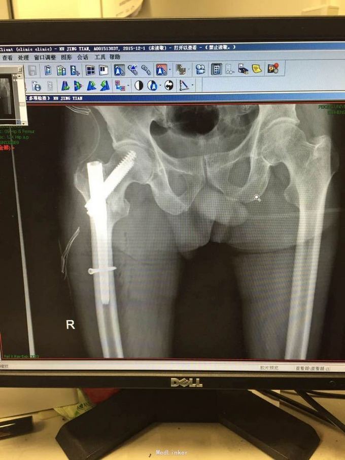 患者,男,76岁 主诉:摔倒后髋部疼痛2天余 病史:患者2天前摔倒,臀部着地,摔倒后自感右侧髋部疼痛,右下肢不能活动,不能直立,伴右下肢外测疼痛,不伴下肢麻木,发冷等感觉。为求诊治,患者遂来我院门诊,门诊行x线,示:右侧股骨粗隆间骨折。闷着以“右侧股骨粗隆间骨折”收入我科。