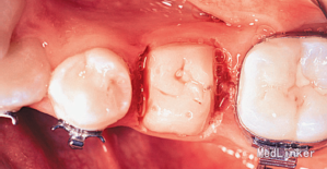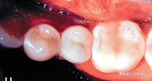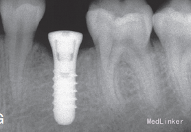 2年正畸治疗结束后,乳磨牙仍在。一年以后,患者18岁成年,拔除乳磨牙,植入植体,半年后套冠,效果很好,患者满意。有些先天缺失第二前磨牙的患者,若第二乳磨牙比较健康,可以减径后树脂修复参与正畸治疗,这样有保存骨量,维持牙弓间隙,保持与对合牙功能接触以免对合牙伸长的作用。骨量的保存利于植体的植入。
