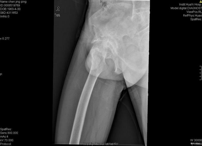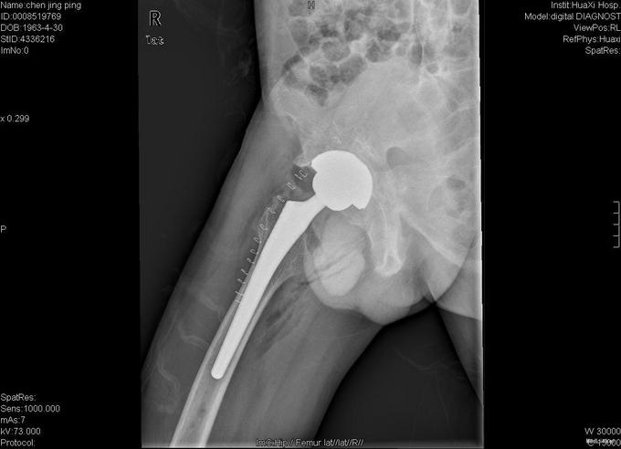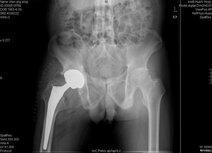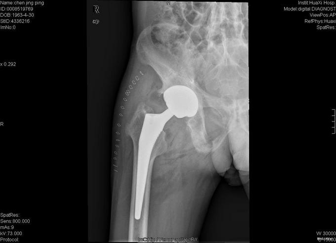 诊断:强直性脊柱炎 右髋关节强直 治疗:完善相关检查后在全麻下行右侧全髋关节置换术+髋臼成形术,手术顺利,术后予以抗炎+抗凝+阵痛等治疗。