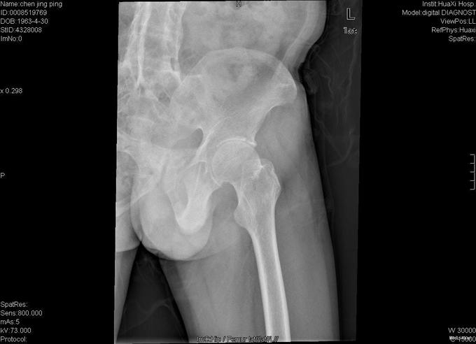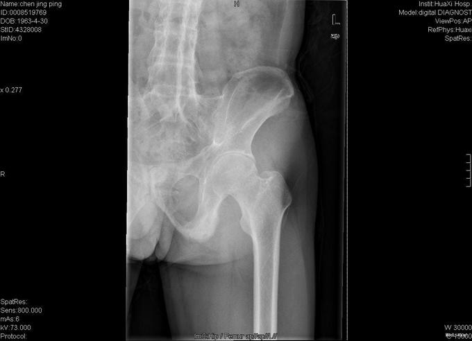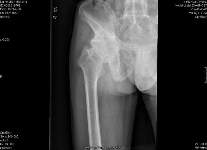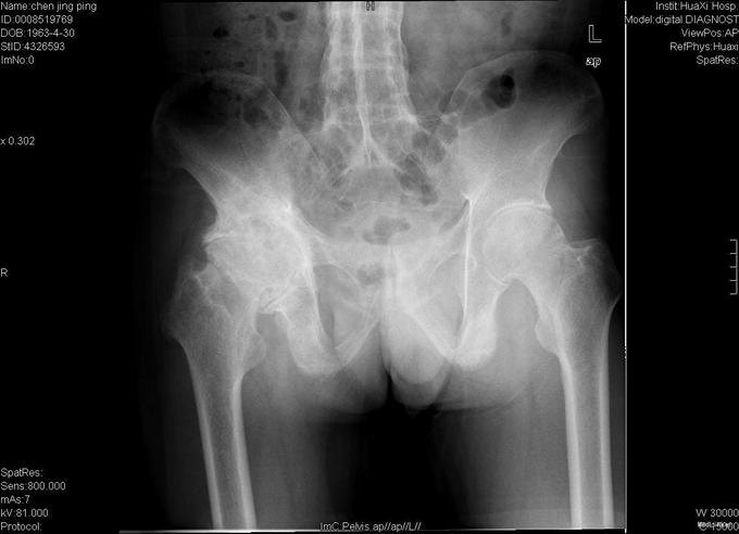 主诉:腰背部、右髋渐进疼痛15年,右髋强直8年,加重1年 现病史:15年前无明显原因出现腰背部疼痛,右髋关节疼痛,为酸胀痛,可耐受,休息后症状自行缓解。5年前患者出现驼背,脊柱活动受限,右髋强直活动受限,在风湿免疫科就诊,诊断为:强直性脊柱炎,右股骨头坏死,予以口服善存片、萘普生等药物治疗,疼痛稍减轻,可自行行走,连续行走距离2000米左右;1年前患者感右髋疼痛明显加重,行走距离变短,口服止痛药不见好转。