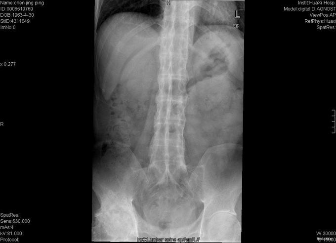 查体:跛行步态,强迫体位,脊柱强直后凸畸形,活动受限。右髋强直畸形,压痛、叩痛,无瘢痕、窦道,无皮损、皮癣,活动受限。双下肢感觉无明显异常。 辅助检查:x线片:脊柱呈"竹节样"改变,腰椎小关节间隙模糊,双侧骶髂关节及右髋关节间隙消失,骨性融合。