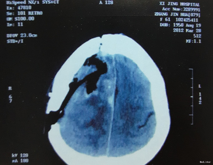 患者术后第1天即意识清楚,神经功能完全恢复正常,无明显后遗症及并发症,顺利康复出院。 术后复查颅脑CT示:肿瘤切除干净,周围水肿基本消失,大脑中线结构恢复正常